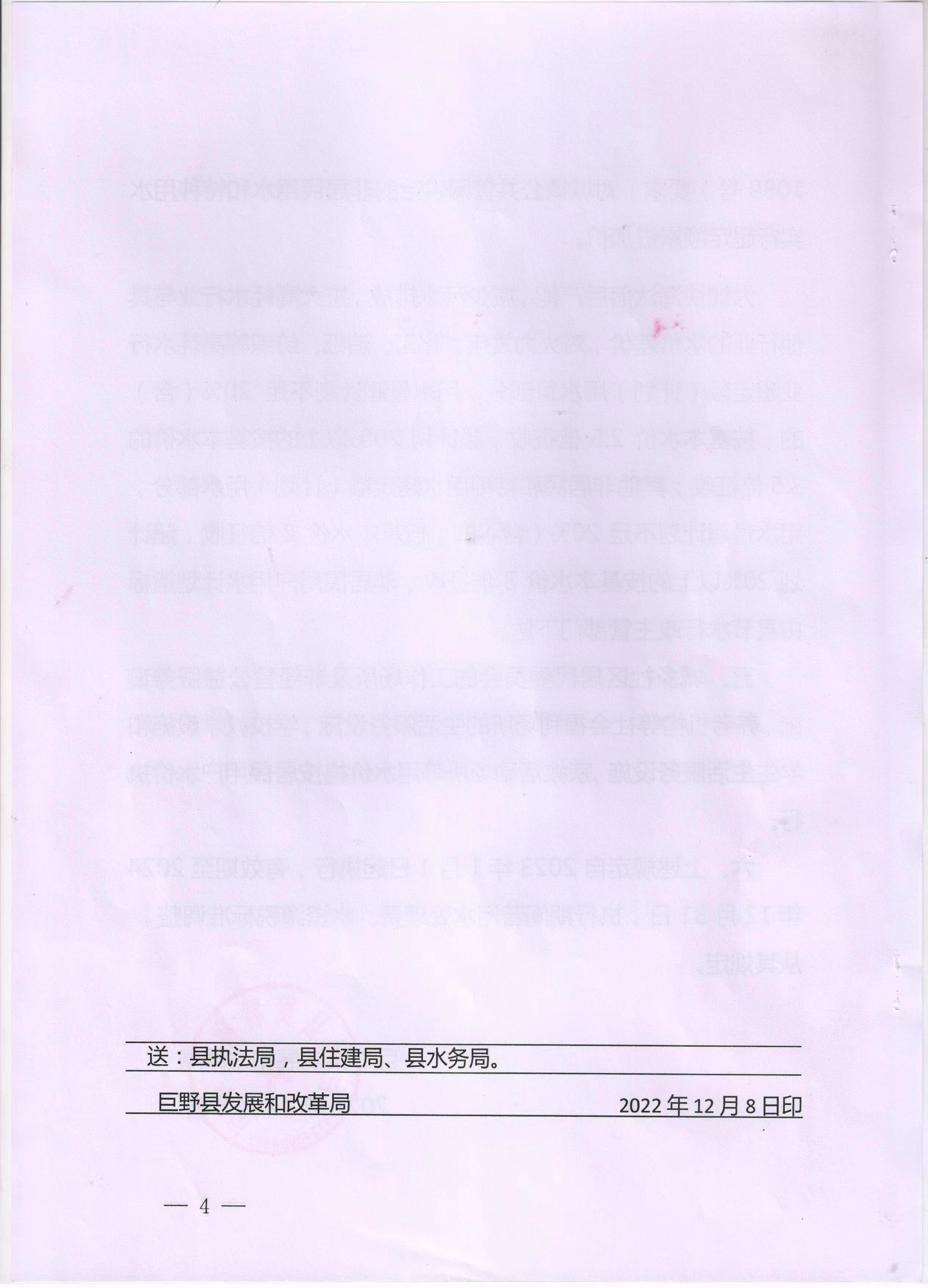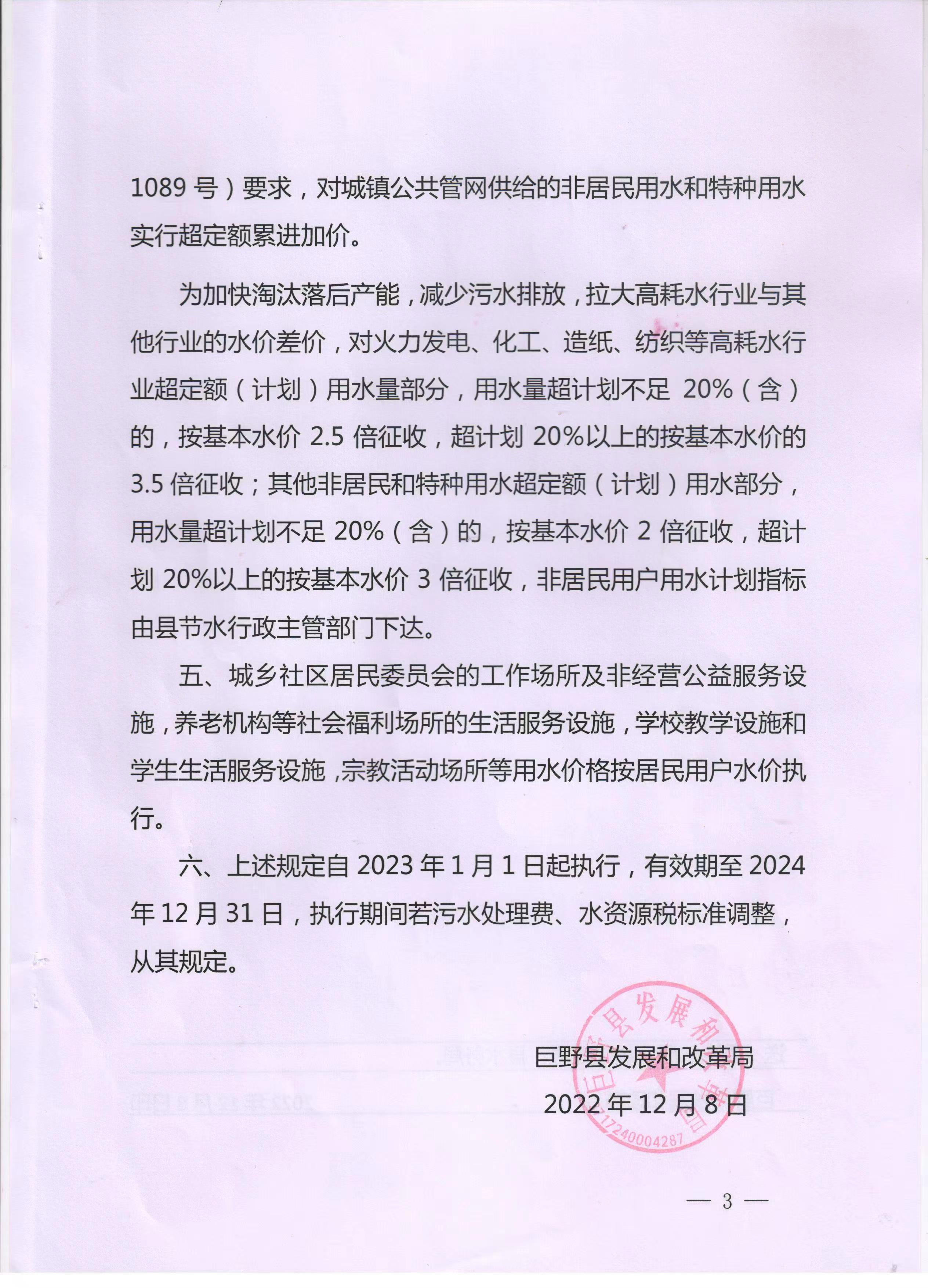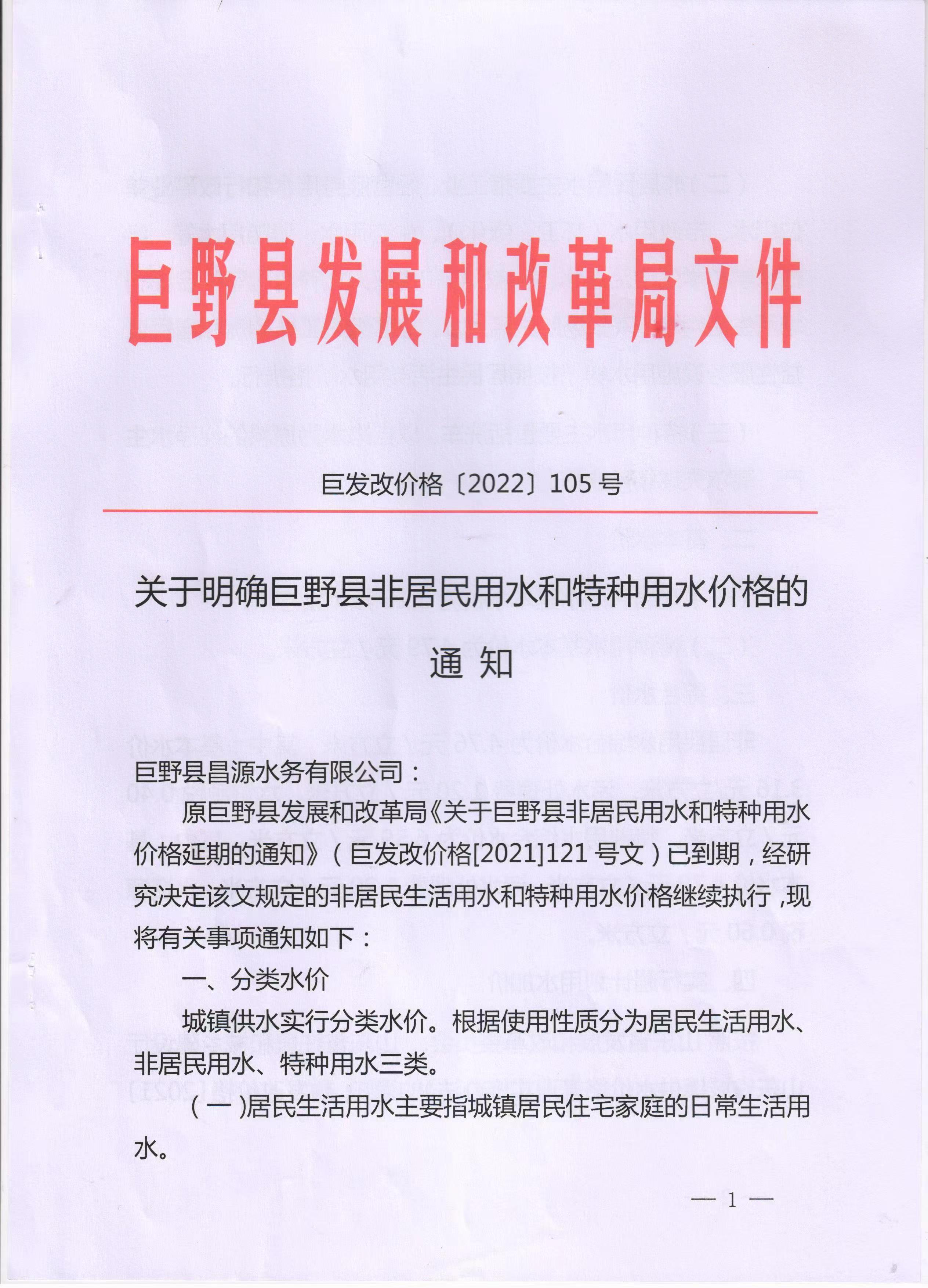 關(guān)于公布巨野縣非居民用水和特種用水價(jià)格的通知