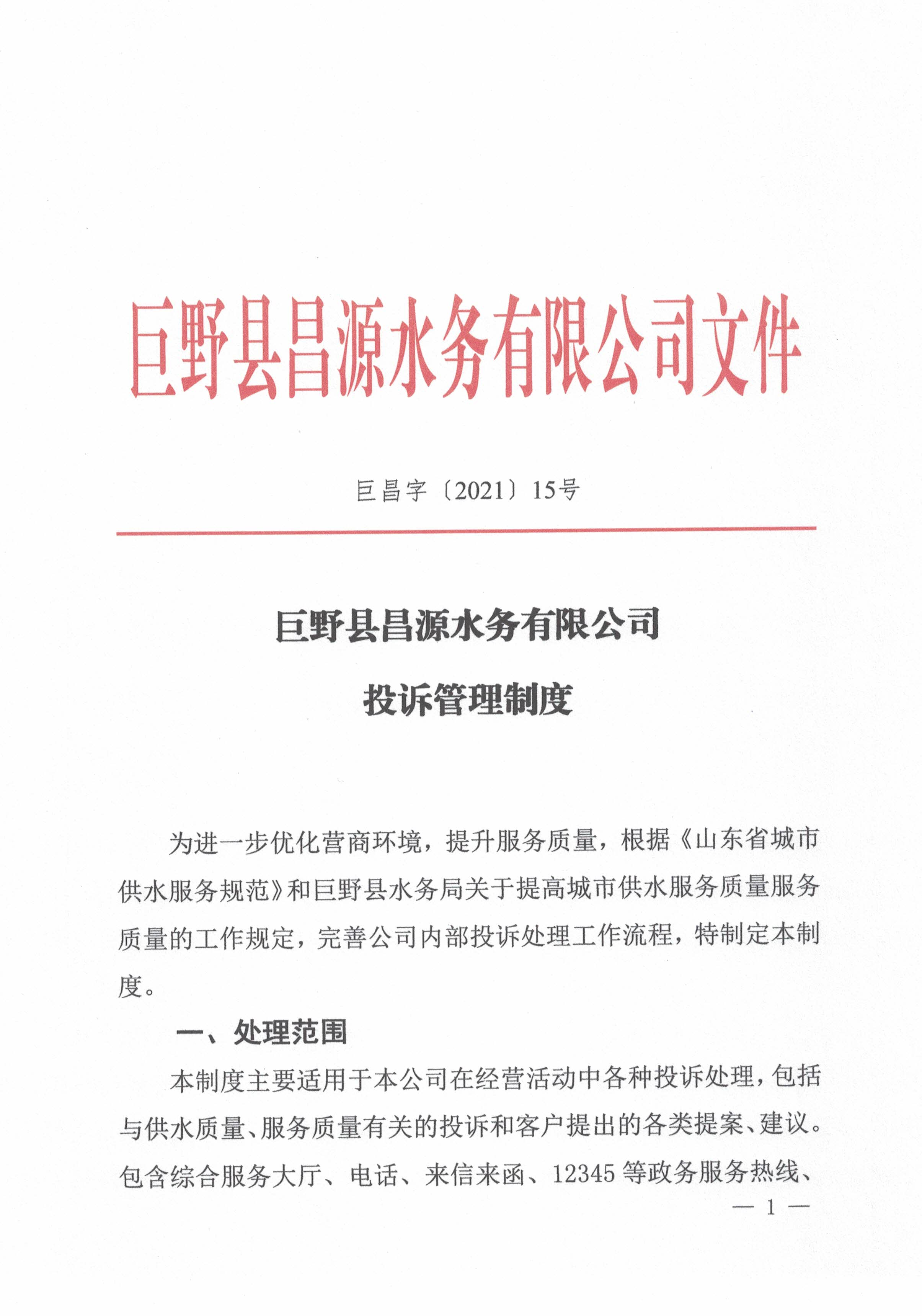 巨野縣昌源水務(wù)有限公司投訴管理制度