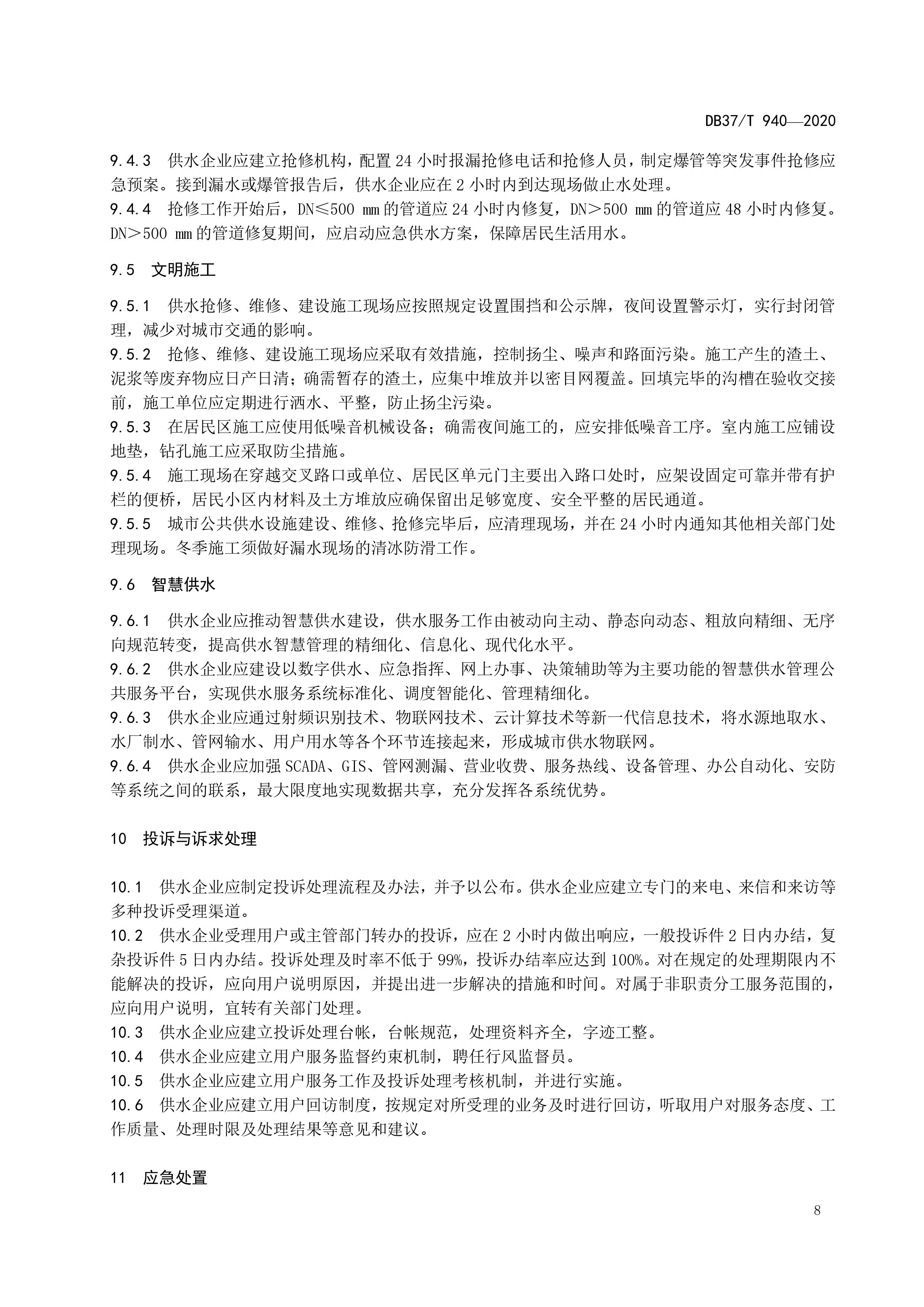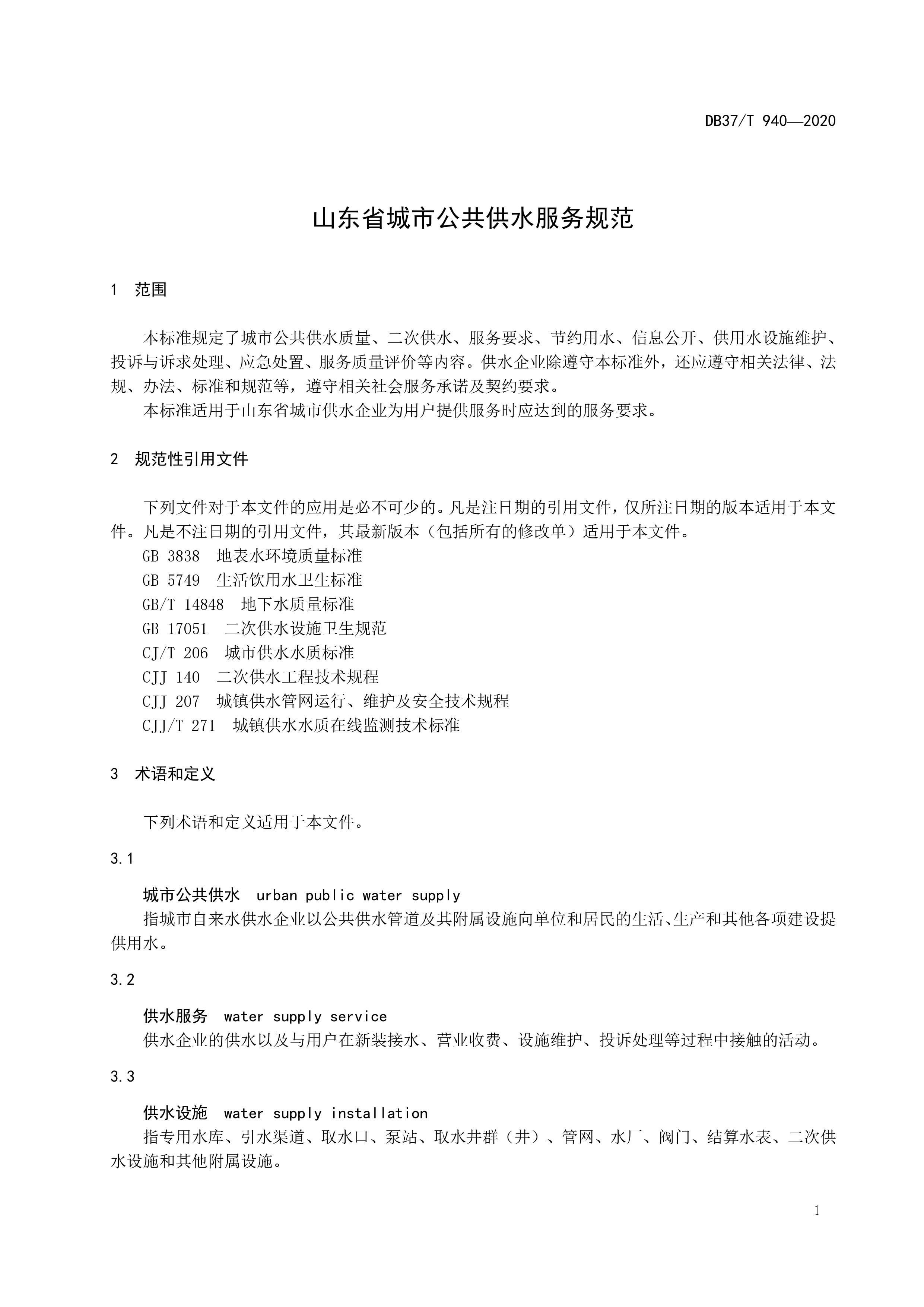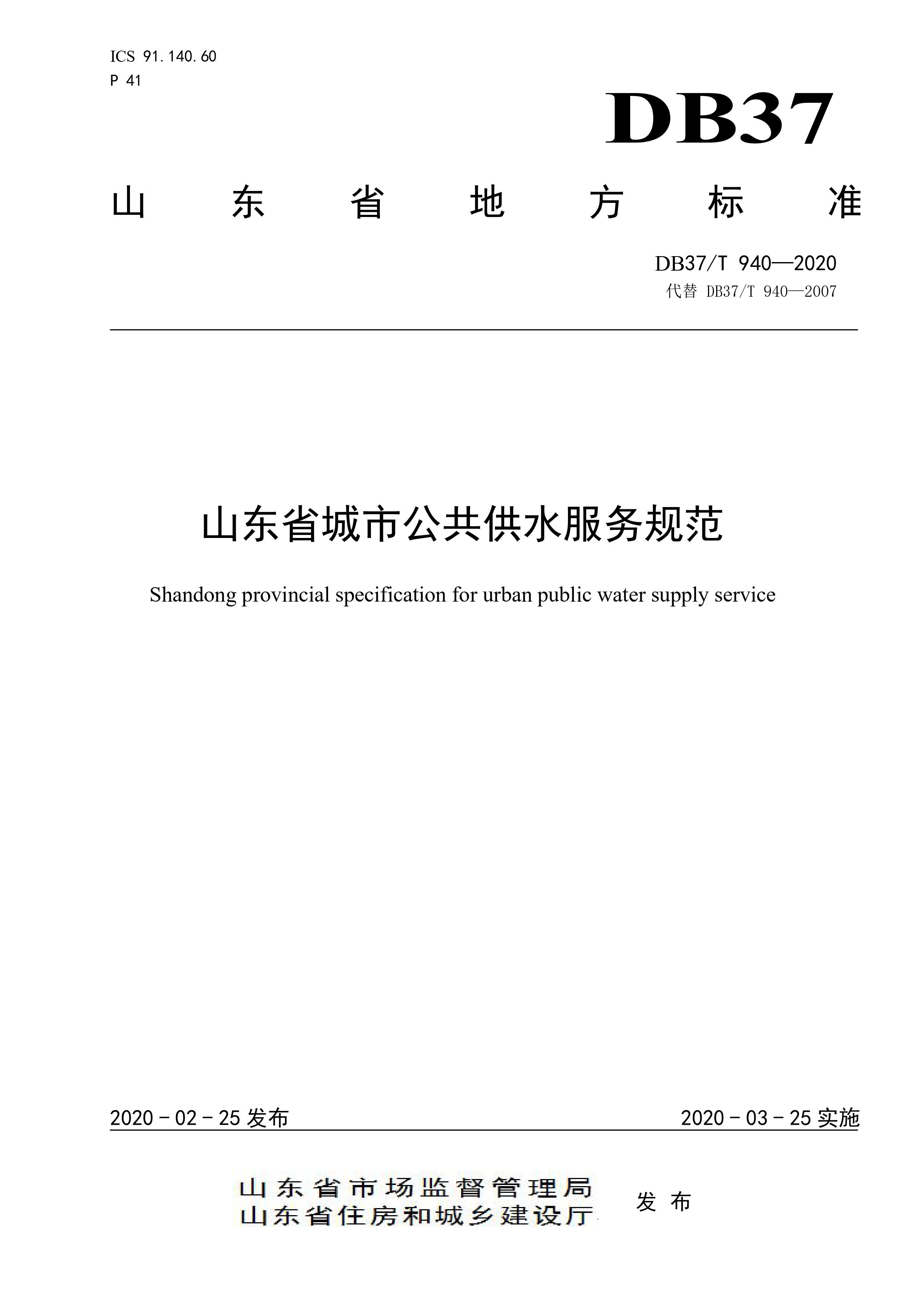 山東省城市公共供水服務(wù)規(guī)范(DB37T 940-2020)