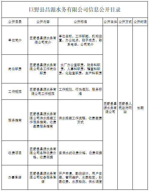 巨野縣昌源水務(wù)有限公司信息公開基本目錄